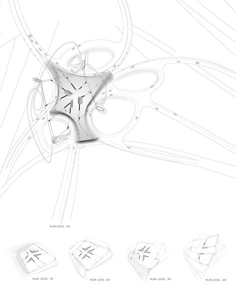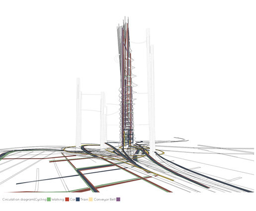 The core of each tower is an integral part of a dynamic communication system linked with the city's highways. This network contemplates both existing and future transportation systems capable of dispatching urban dwellers to different levels above ground and between towers.